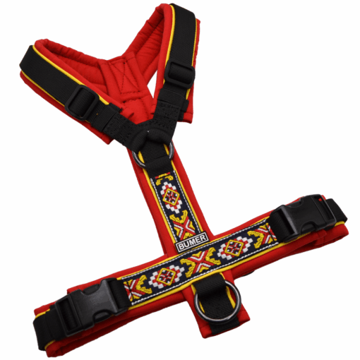 BUMER Hundegeschirr BOHO, gepolstert ohne geteilten Bruststeg, Größe S, Gurtband: PREMIUM Pitch Black, Softshell: Rot, Ringe: schwarz (Edelstahl), Schnallen: DURAFLEX®, Paspel: Sonnenblume (komplett). Dieses Geschirr kannst Du in der Größe S bestellen. Das gepolsterte Softshell Material ist pflegeleicht und sehr strapazierfähig, anschmiegsam, so dass sich Dein Hund sicherlich wohlfühlen wird.