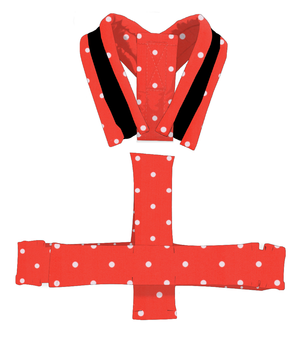 Das Hundegeschirr kann mit grauen, wie auch bunten Paspeln entlang der Schulter (Brustbein – Nacken) ausgestattet werden.
