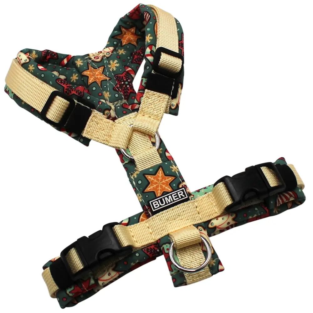 BUMER Hundegeschirr, gepolstert, Größe XXS, Gurtband: PREMIUM Buttercreme, Softshell: Weihnachten #14, Ringe: silberfarbig (Edelstahl), Schnallen: schwarz (DURAFLEX®), Applikation