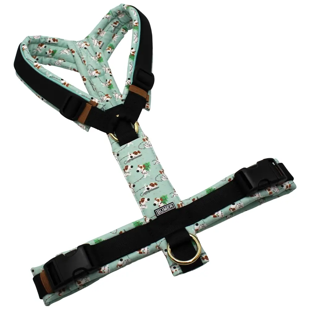 BUMER Hundegeschirr, gepolstert ohne geteilten Bruststeg, Größe L, Gurtband: PREMIUM Pitch Black, Softshell: WEIHNACHTEN #15, Ringe: goldfarbig, Schnallen: schwarz, Applikation