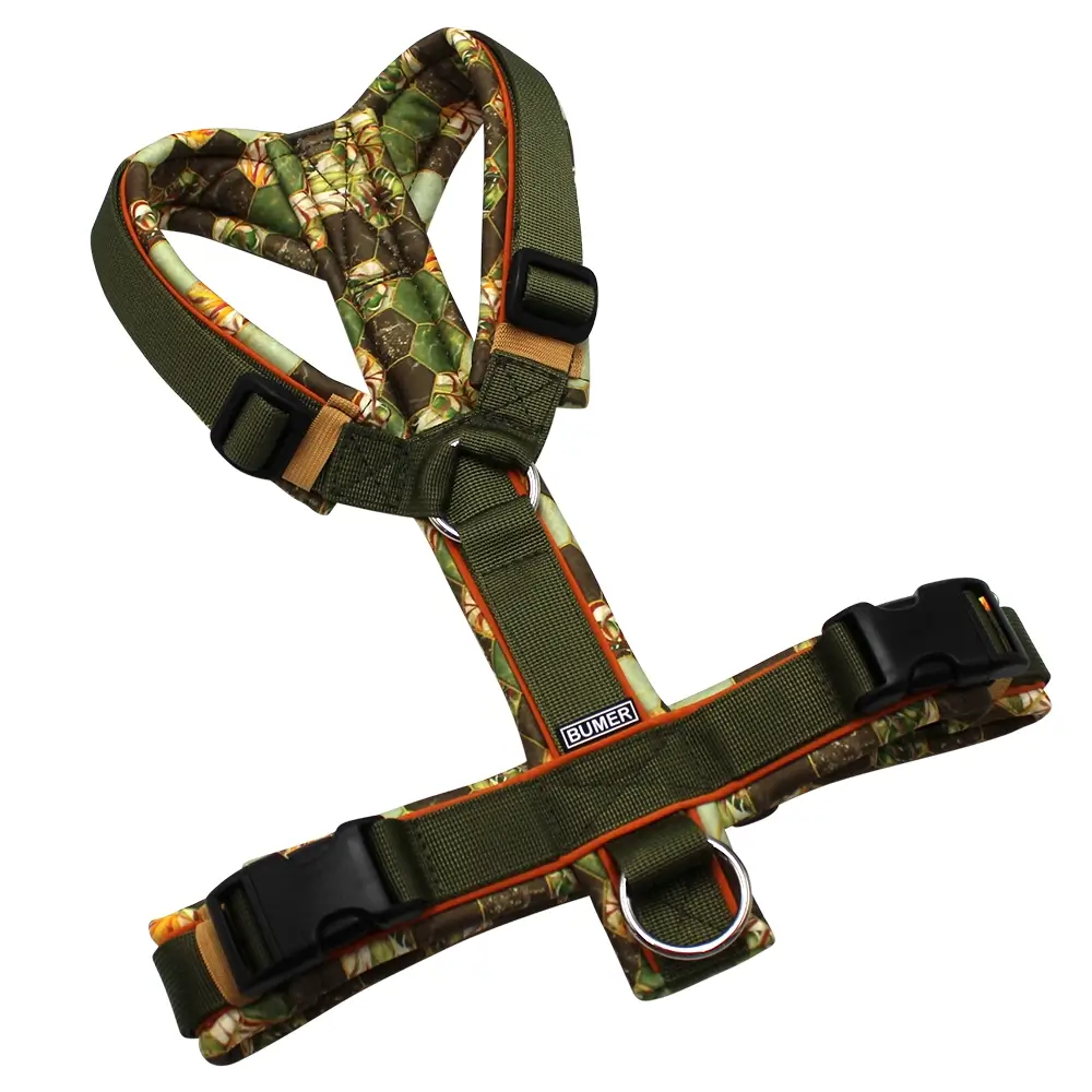 BUMER Hundegeschirr, gepolstert ohne geteilten Bruststeg, Größe M, Gurtband: PREMIUM Wiesen Salbei, Softshell: Waben Olive, Ringe: silberfarbig (Edelstahl), Schnallen: schwarz (DURAFLEX®). Dieses Geschirr kannst Du in der Größe M bestellen. Das gepolsterte Softshell Material ist pflegeleicht und sehr strapazierfähig, anschmiegsam, so dass sich Dein Hund sicherlich wohlfühlen wird.