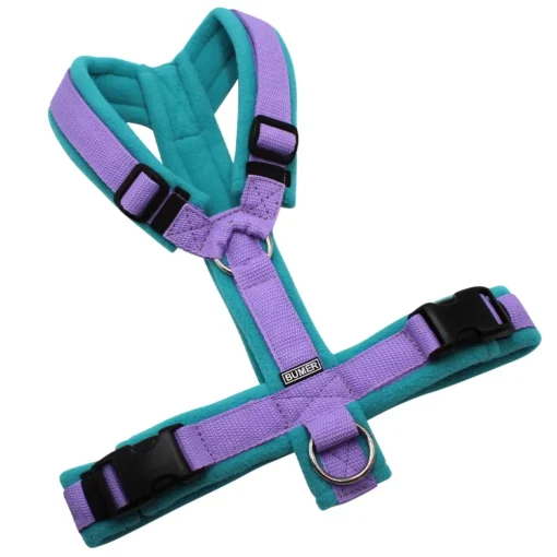 BUMER Hundegeschirr, gepolstert ohne geteilten Bruststeg, Größe M, Gurtband: PREMIUM X Violet Veil, Fleece: Türkis Reef, Ringe: silberfarbig (Edelstahl), Schnallen: schwarz (DURAFLEX®). Dieses Geschirr kannst Du in der Größe M bestellen. Das gepolsterte Fleece Material ist pflegeleicht und sehr strapazierfähig, anschmiegsam, so dass sich Dein Hund sicherlich wohlfühlen wird.