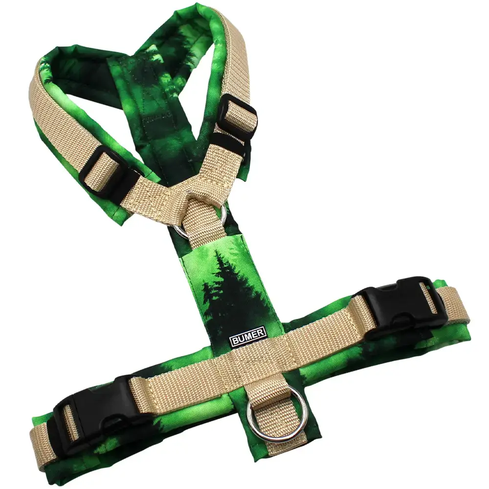 BUMER Hundegeschirr, gepolstert ohne geteilten Bruststeg, Größe M, Gurtband: Standard PLUS Creme, OXFORD: Waldstimmung, Ringe: silberfarbig (Edelstahl), Schnallen: schwarz, Applikation