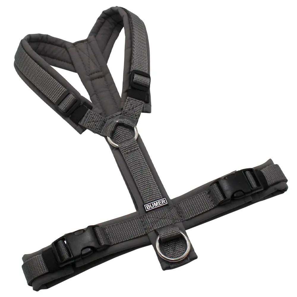 BUMER Hundegeschirr, gepolstert ohne geteilten Bruststeg, Größe S/M, Gurtband: Dunkelgrau, Softshell: Mittelgrau, Ringe: silberfarbig (Edelstahl), Schnallen: schwarz. Dieses Geschirr kannst Du in der Größe S/M bestellen. Das gepolsterte Softshell Material ist pflegeleicht und sehr strapazierfähig, anschmiegsam, so dass sich Dein Hund sicherlich wohlfühlen wird.