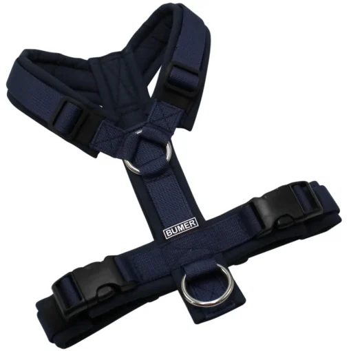 BUMER Hundegeschirr, gepolstert ohne geteilten Bruststeg, Größe XS, Gurtband: PREMIUM Midnight Indigo, Softshell: Navy, Ringe: silberfarbig (Edelstahl), Schnallen: schwarz