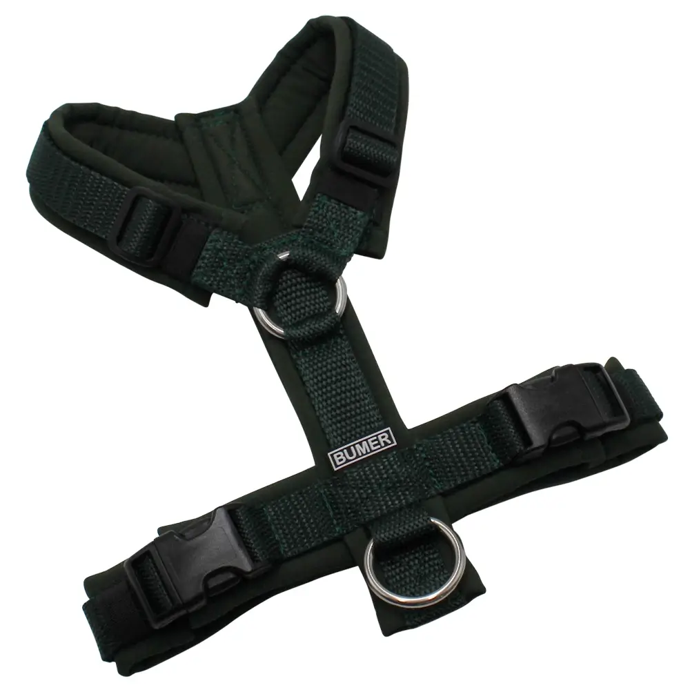 BUMER Hundegeschirr, gepolstert ohne geteilten Bruststeg, Größe XS, Gurtband: PREMIUM X Dunkelgrün, Softshell: Dunkelolive, Ringe: silberfarbig (Edelstahl), Schnallen: schwarz. Dieses Geschirr kannst Du in der Größe XS bestellen. Das gepolsterte Softshell Material ist schön anschmiegsam, so dass sich Dein Hund sicherlich wohlfühlen wird. Das Hundegeschirr fällt schön weich und ist pflegeleicht und sehr strapazierfähig.