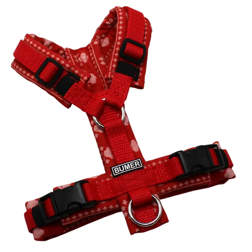BUMER Hundegeschirr, gepolstert ohne geteilten Bruststeg, Größe XXS, Gurtband: PREMIUM X Feuerrot, Softshell: Weihnachten #16, Ringe: silberfarbig (Edelstahl), Schnallen: schwarz