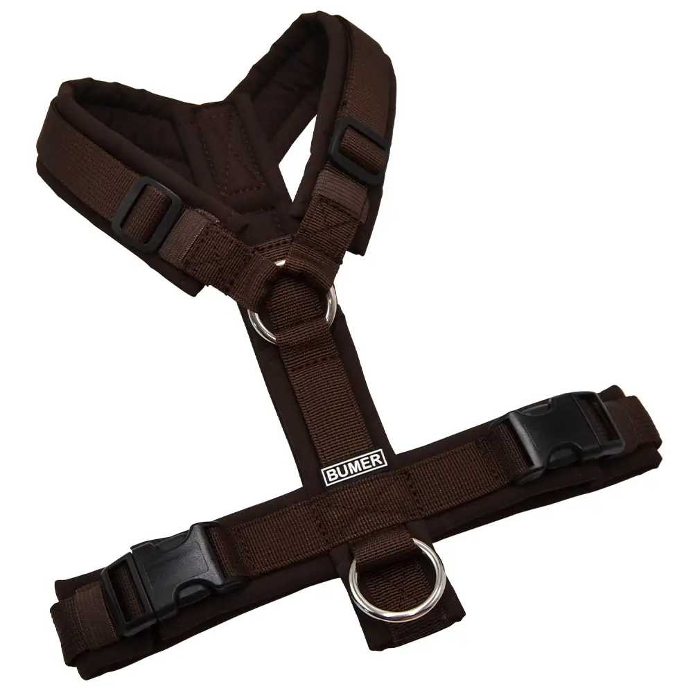 BUMER Hundegeschirr, gepolstert ohne geteilten Bruststeg, Zwischengröße XS/S, Gurtband: PREMIUM Cocoa Bean, Softshell: Antikbraun, Ringe: silberfarbig (Edelstahl), Schnallen: schwarz (DURAFLEX®)