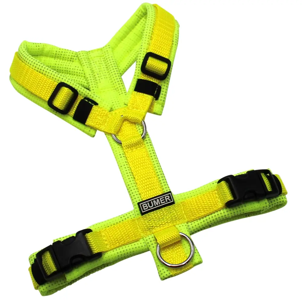 BUMER Hundegeschirr, gepolstert ohne geteilten Bruststeg, Zwischengröße XXS/XS, Gurtband: Neongelb, Softshell: Camou REFLEX Neongelb, Ringe: silberfarbig (Edelstahl), Schnallen: schwarz. Dieses Geschirr kannst Du in der Zwischengröße XXS / XS bestellen. Das gepolsterte Softshell Material ist pflegeleicht und sehr strapazierfähig, anschmiegsam, so dass sich Dein Hund sicherlich wohlfühlen wird.