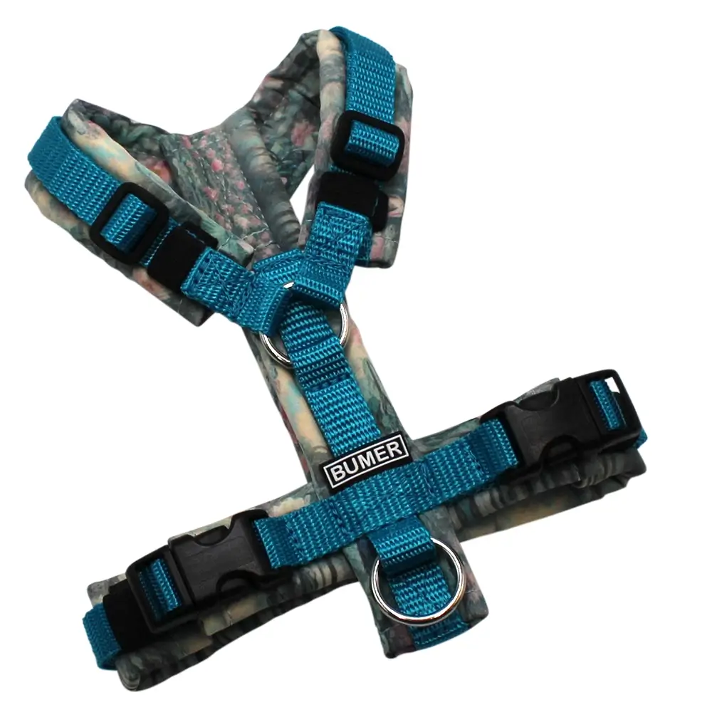 BUMER Hundegeschirr, Gurtband: Türkis (Standard PLUS), Softshell: Symphony of Water Lilies, gepolstert ohne geteiltem Bruststeg, Größe XXS, Ringe: silberfarbig (Edelstahl), Schnallen: schwarz (DURAFLEX®)