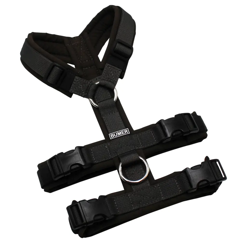 BUMER Sicherheitsgeschirr, gepolstert ohne geteiltem Bruststeg, Größe XS, Gurtband: PREMIUM Camouflage Green, Softshell: Ebenholzbraun, Ringe: silberfarbig (Edelstahl), Schnallen: schwarz (DURAFLEX®)