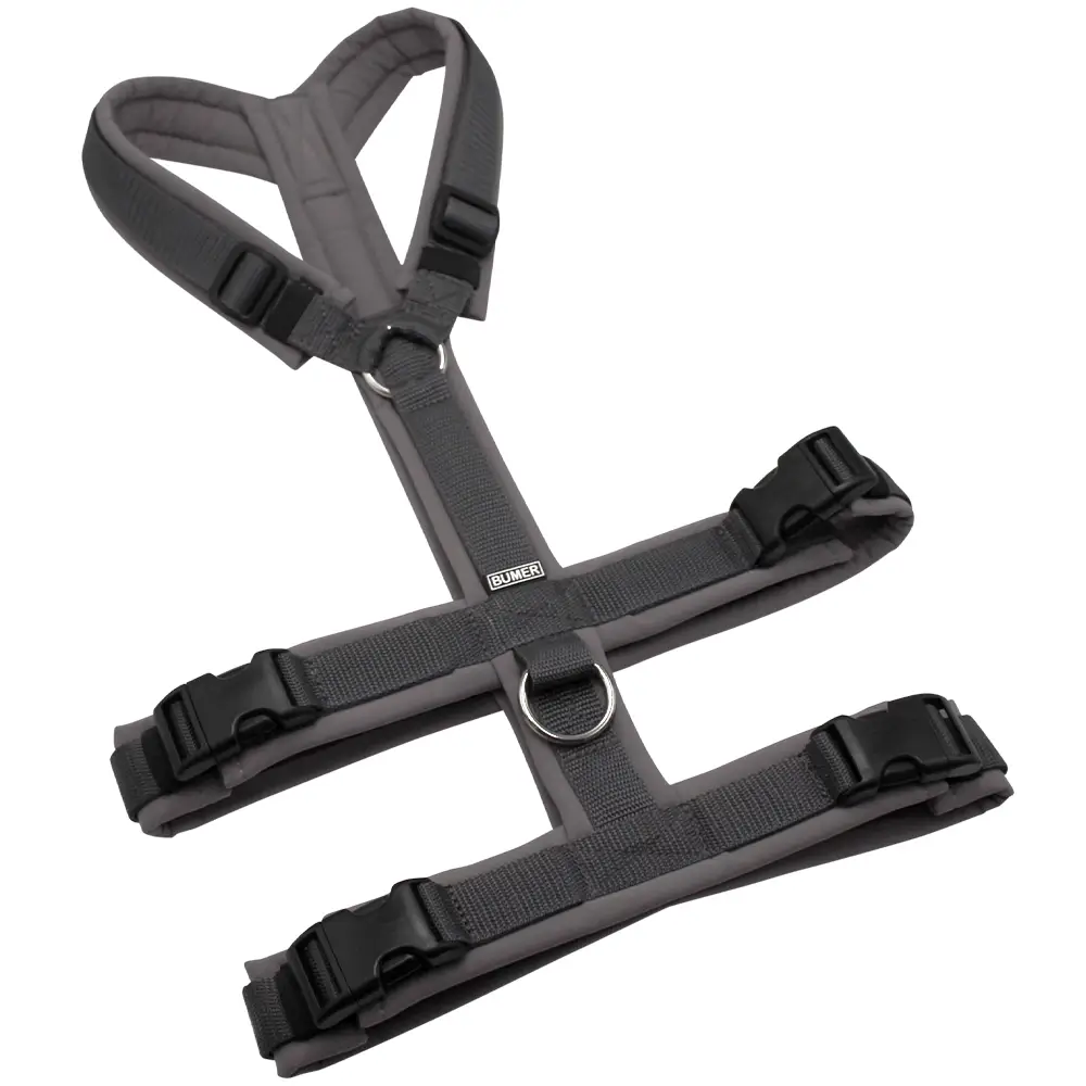 BUMER Sicherheitsgeschirr, gepolstert ohne geteilten Bruststeg, Größe L, Gurtband: Anthrazit, Softshell: Grau, Ringe: silberfarbig (Edelstahl), Schnallen: schwarz. Dieses Sicherheitsgeschirr kannst Du in der Größe L bestellen. Das gepolsterte Softshell Material ist schön anschmiegsam, so dass sich Dein Hund sicherlich wohlfühlen wird. Das Hundegeschirr fällt schön weich und ist pflegeleicht und sehr strapazierfähig.