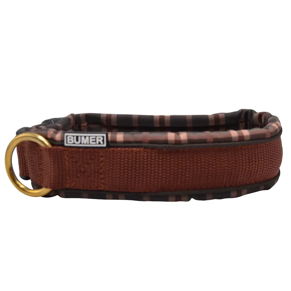 BUMER Steckhalsband, Hundehalsband für Hunde, gepolstert, Halsumfang: 39cm, Gurtband: rotbraun, Softshell: Chestnut Plaid, Ringe: goldfarbig, Paspel: Espresso